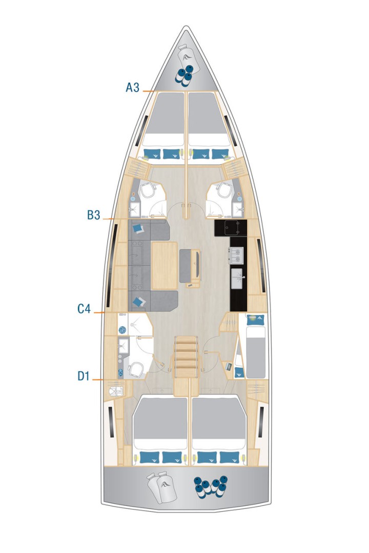 На цій яхті можуть комфортно розміститися до 10 гостей, на ній є 5 каюти , і 3 WC (туалет).
