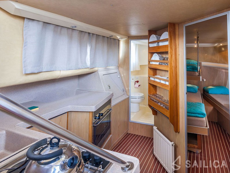 На цій яхті можуть комфортно розміститися до 4 гостей, на ній є 2 каюти, і 2 WC (туалет).