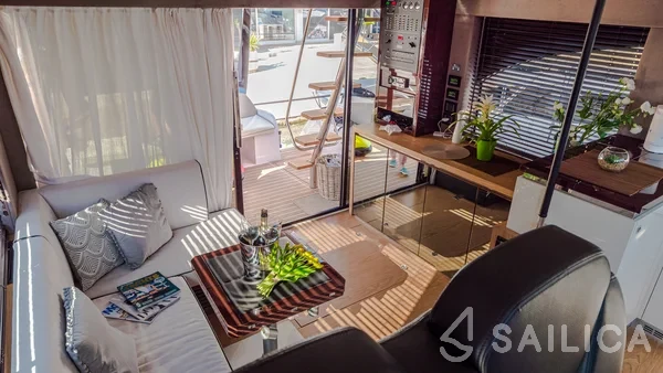 Sessa Fly 47 Stardust має 3 каюти і може комфортно розмістити 6 осіб. Вона зручно обладнана 2 туалетом (вбиральнею), Розетки 12В, Розетки 220В, Платформа для купання, Тикова палуба і Мікрохвильова піч.